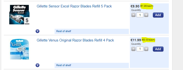 I think we can tell which is aimed at men and which one is aimed at women. One is €1.98 per blade and the other is €3.00 per blade..!!!