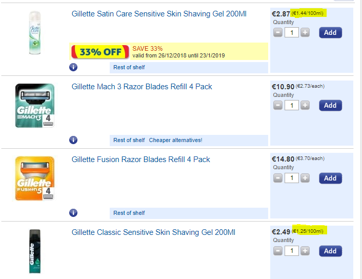Let’s take a look to prove my point. This morning I went on to one of the main supermarket chains website and searched for Gillette. First up is shaving gel.